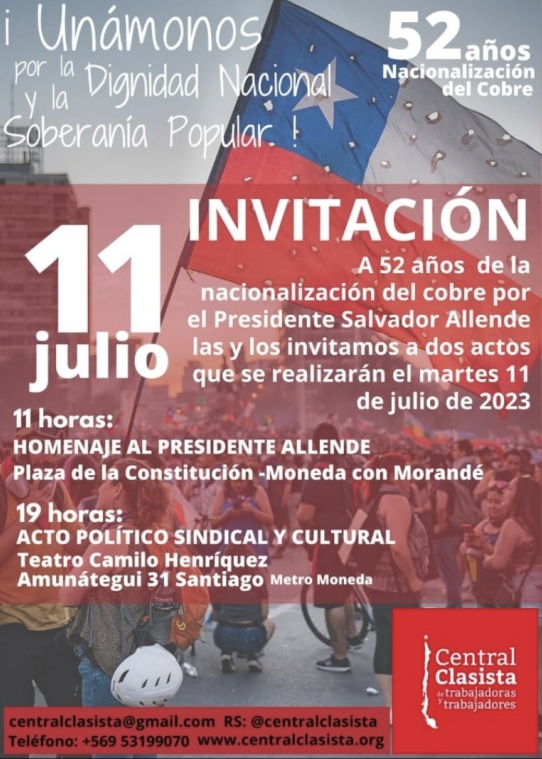 [10 de julio de 2023] La agrupación sindical Central Clasista de Trabajadoras y Trabajadores, invita a participar de dos actos enmarcados en el 52º aniversario de la nacionalización del cobre, ambos a realizarse mañana martes 11 de julio.