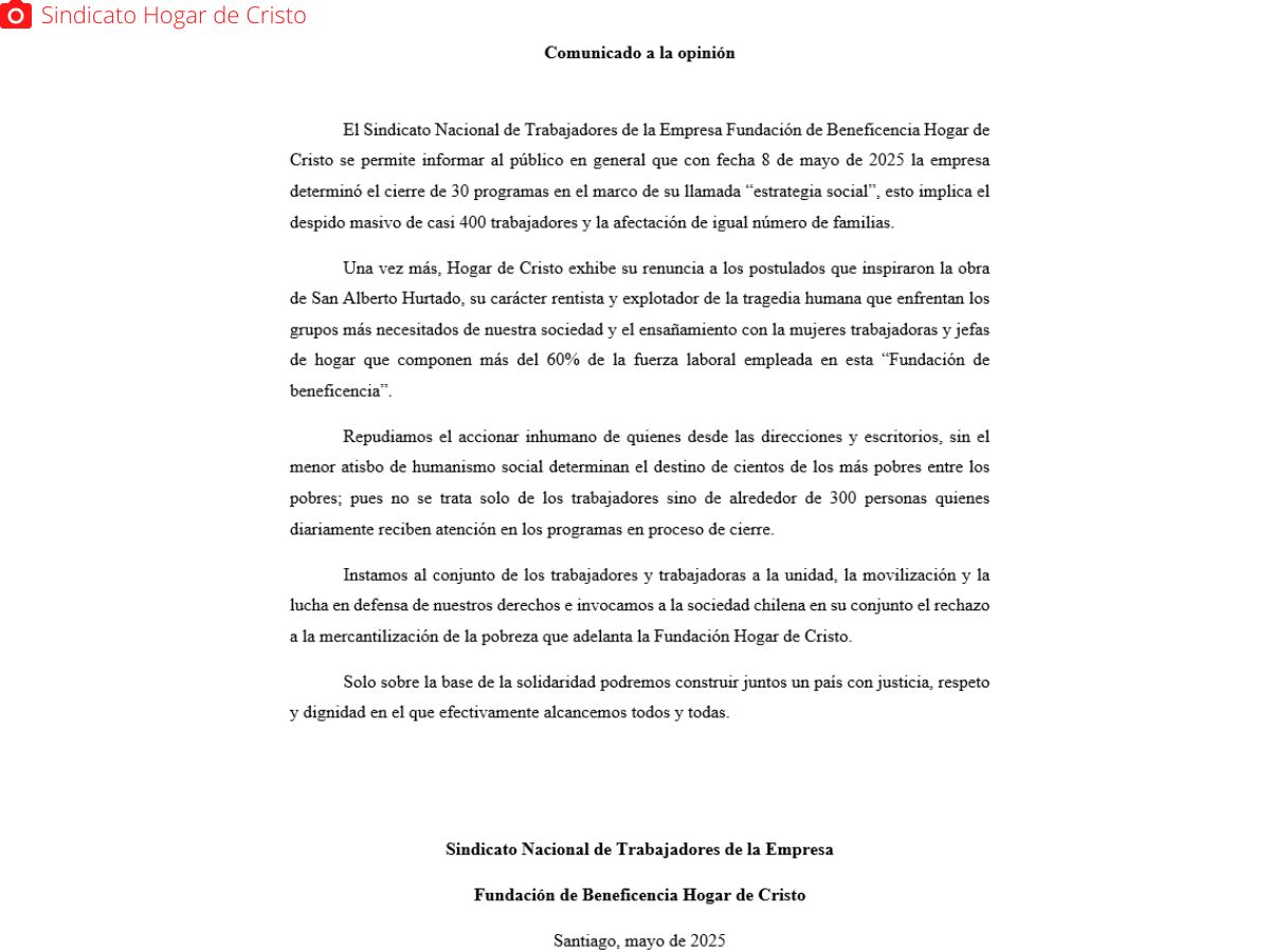 Manifestaciones Comunicado del Sindicato de Trabajadores Hogar de Cristo frente a cierre de programas y despidos